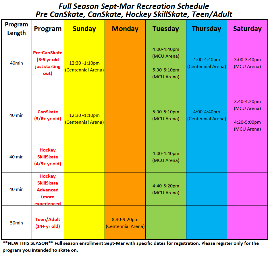 (Pre CanSkate, CanSkate, Hockey SkillSkate and Teen/Adult)
